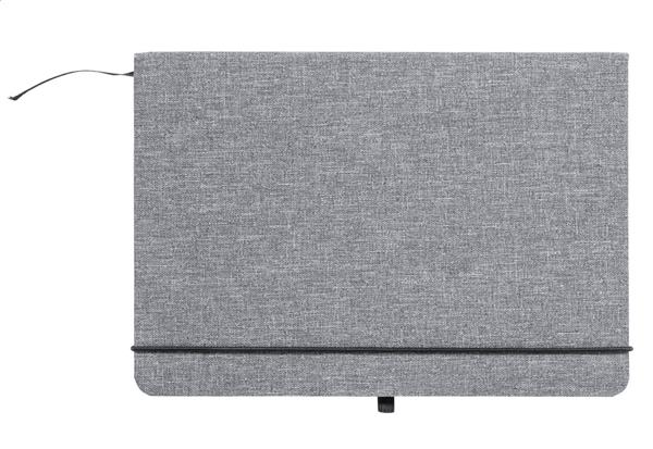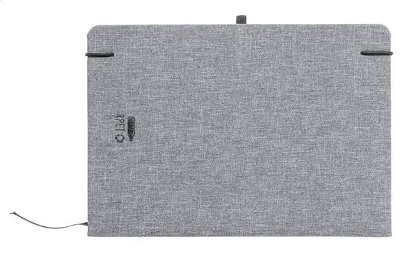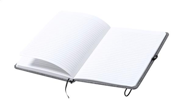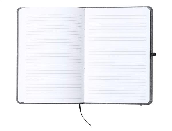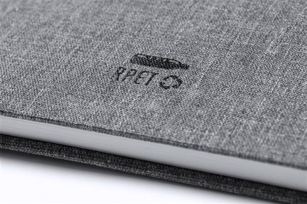 Notes z okładką z poliestru 600D RPET, 100 kartek w linie, zakładką i gumką. Rozmiar A5.