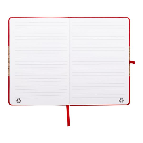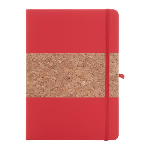 Notes z okładką pokrytą naturalnym korkiem i skórą PU z recyklingu, z dopasowaną kolorową zakładką, elastyczną opaską i uchwytem na długopis. Zawiera 80 kartek w linie z papieru makulaturowego. Rozmiar A5.