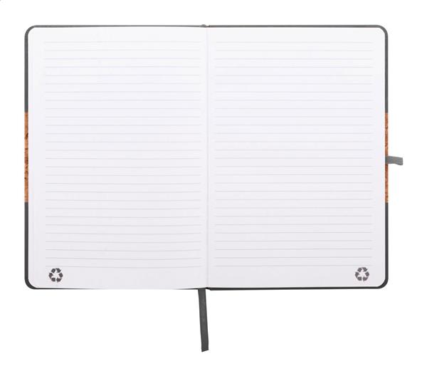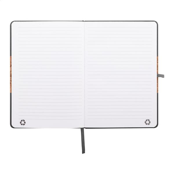 Notes z okładką pokrytą naturalnym korkiem i skórą PU z recyklingu, z dopasowaną kolorową zakładką, elastyczną opaską i uchwytem na długopis. Zawiera 80 kartek w linie z papieru makulaturowego. Rozmiar A5.