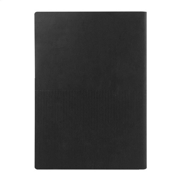 Notes w oprawie z recyklingowanej skóry PU, z ozdobnymi paskami i metalową płytką z logo. Z zakładką i 80 kartkami w linie z papieru z recyklingu. Format A5.