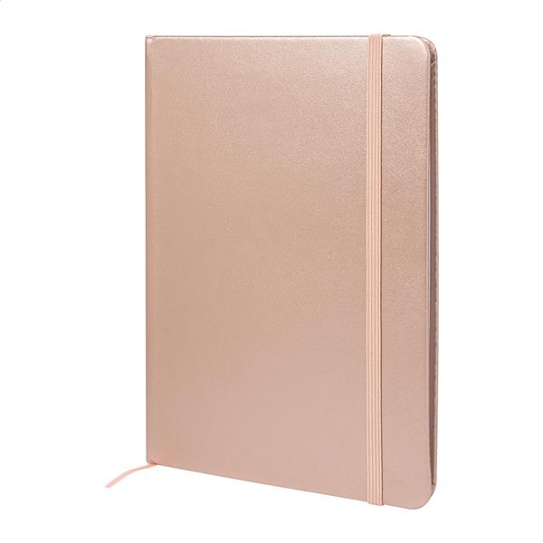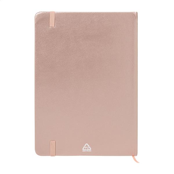 Notes w metalicznej oprawie z recyklingowanej skóry PU, ze 100 kartkami w linie z papieru pochodzącego z recyklingu. Z zakładką w pasującym kolorze i gumką. Format A5.