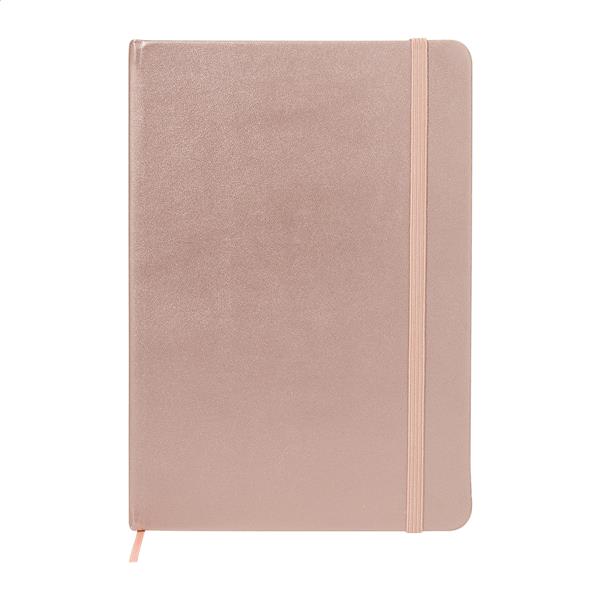 Notes w metalicznej oprawie z recyklingowanej skóry PU, ze 100 kartkami w linie z papieru pochodzącego z recyklingu. Z zakładką w pasującym kolorze i gumką. Format A5. Primary Color: róża Material 2: Papier z recyklingu Rodzaj kartek w notesach: Kartki w linie Rozmiar: A5 Material 1: Skóry PU z recyklingu
