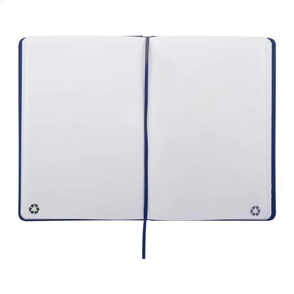 Notes pokryty skórą PU z recyklingu, zawierający 100 gładkich kartek z papieru pochodzącego z recyklingu. Z dopasowaną kolorystycznie zakładką i gumką. Rozmiar A5.