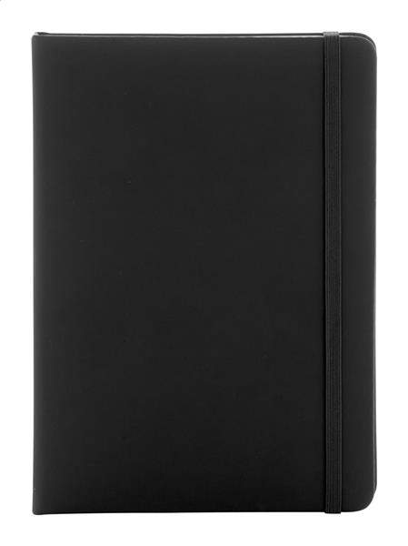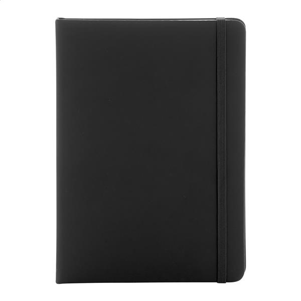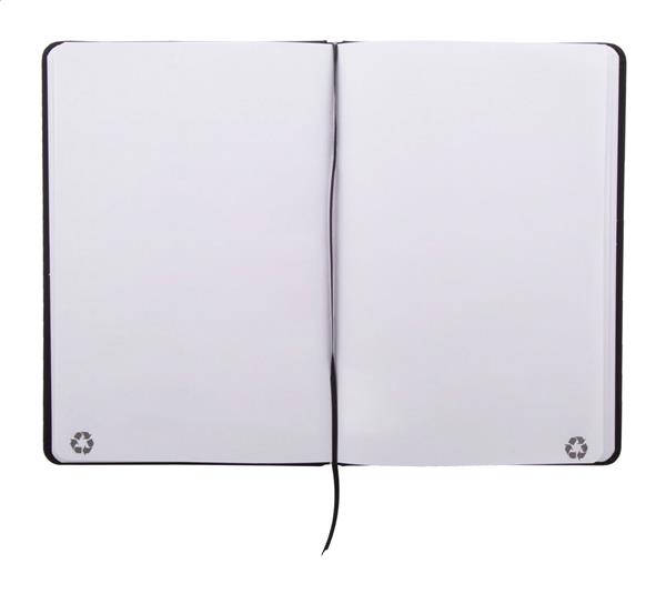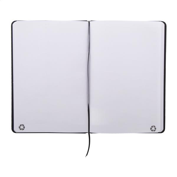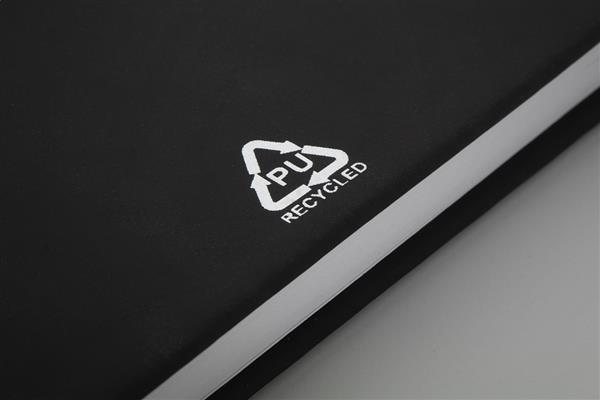 Notes pokryty skórą PU z recyklingu, zawierający 100 gładkich kartek z papieru pochodzącego z recyklingu. Z dopasowaną kolorystycznie zakładką i gumką. Rozmiar A5.