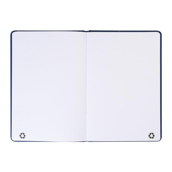Notes pokryty skórą PU z recyklingu, zawierający 100 gładkich kartek z papieru pochodzącego z recyklingu. Z dopasowaną kolorystycznie zakładką i gumką. Rozmiar A5.