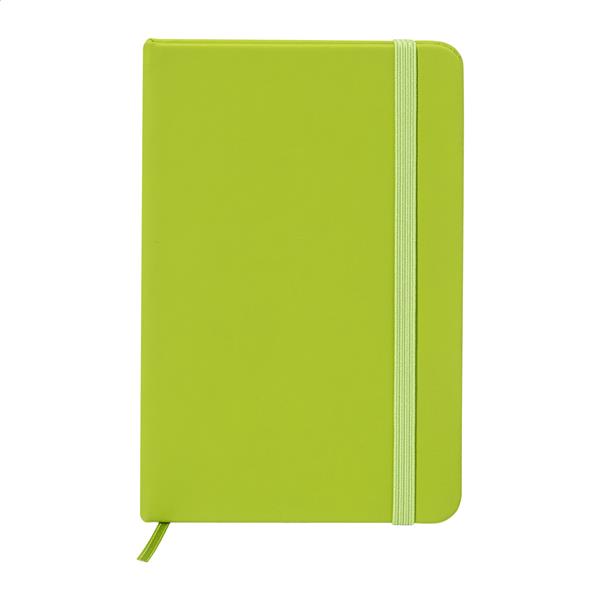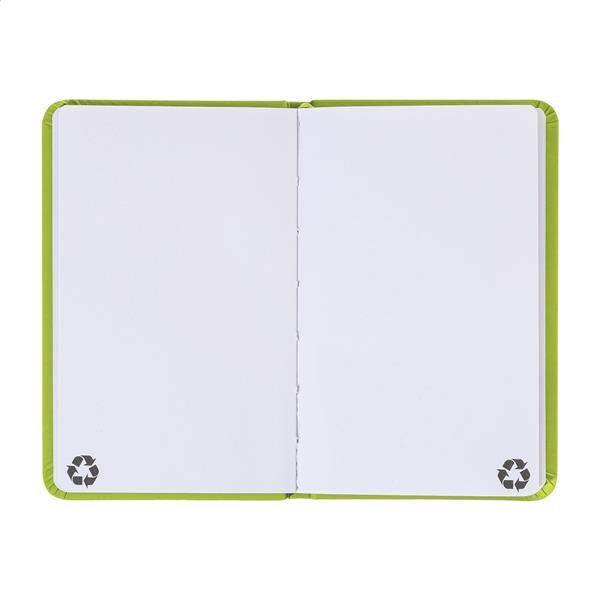 Notes pokryty skórą PU z recyklingu, zawierający 100 czystych kartek z papieru pochodzącego z recyklingu. Z dopasowaną kolorystycznie zakładką i gumką. Rozmiar A6.