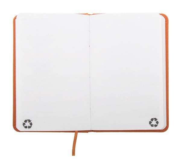 Notes pokryty skórą PU z recyklingu, zawierający 100 czystych kartek z papieru pochodzącego z recyklingu. Z dopasowaną kolorystycznie zakładką i gumką. Rozmiar A6.