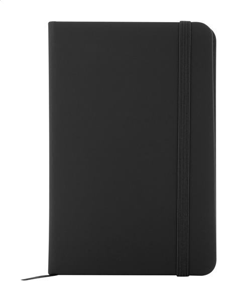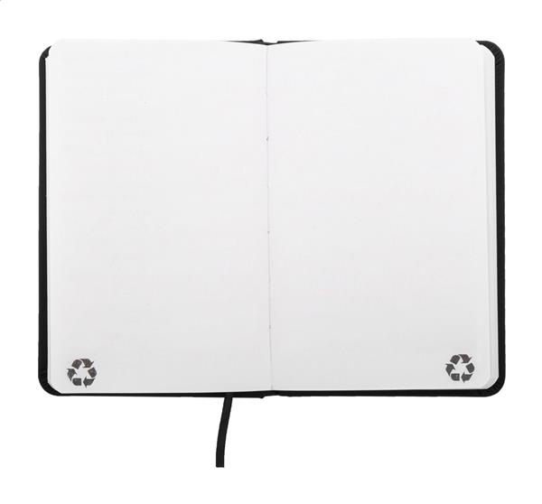 Notes pokryty skórą PU z recyklingu, zawierający 100 czystych kartek z papieru pochodzącego z recyklingu. Z dopasowaną kolorystycznie zakładką i gumką. Rozmiar A6.