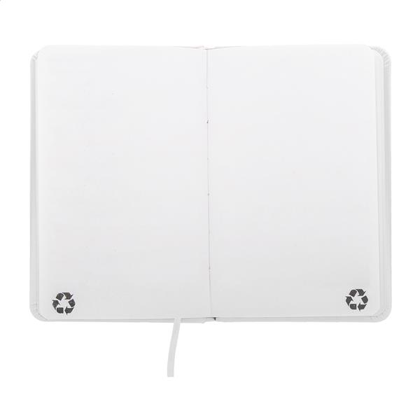 Notes pokryty skórą PU z recyklingu, zawierający 100 czystych kartek z papieru pochodzącego z recyklingu. Z dopasowaną kolorystycznie zakładką i gumką. Rozmiar A6.