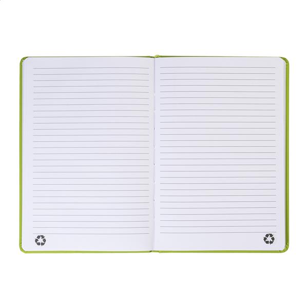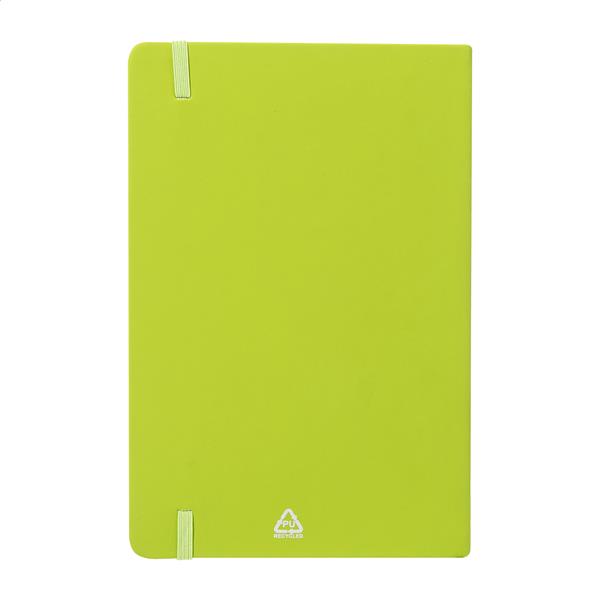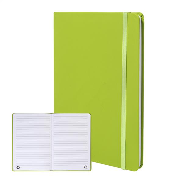 Notes z okładką ze skóry PU z recyklingu ze 100 kartkami w linie z papieru z recyklingu. Z dopasowaną kolorystycznie zakładką i gumką. Rozmiar A5.