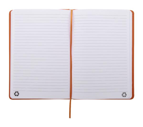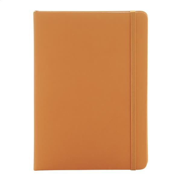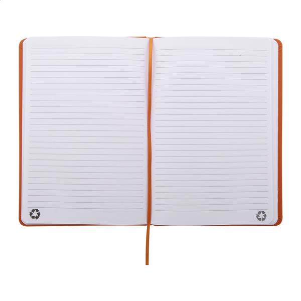 Notes z okładką ze skóry PU z recyklingu ze 100 kartkami w linie z papieru z recyklingu. Z dopasowaną kolorystycznie zakładką i gumką. Rozmiar A5.