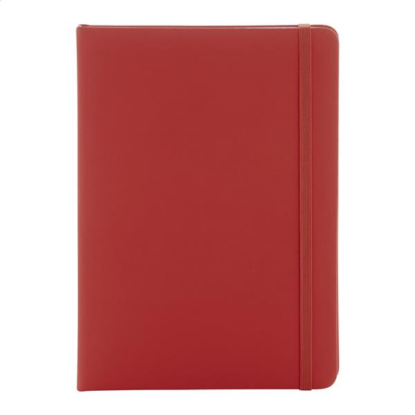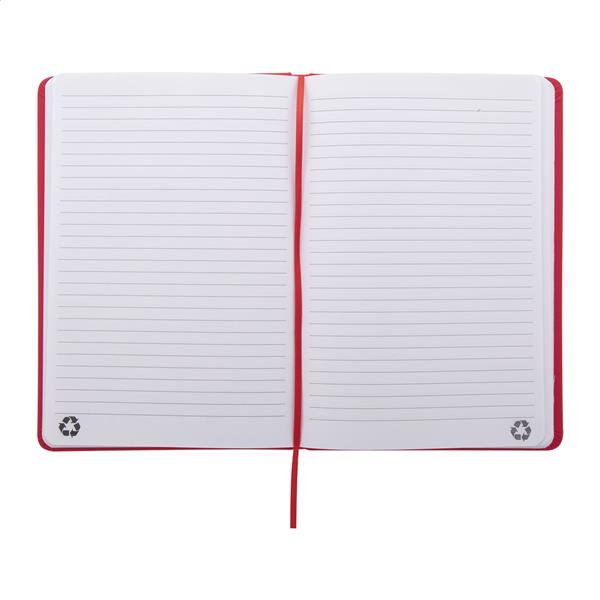 Notes z okładką ze skóry PU z recyklingu ze 100 kartkami w linie z papieru z recyklingu. Z dopasowaną kolorystycznie zakładką i gumką. Rozmiar A5.