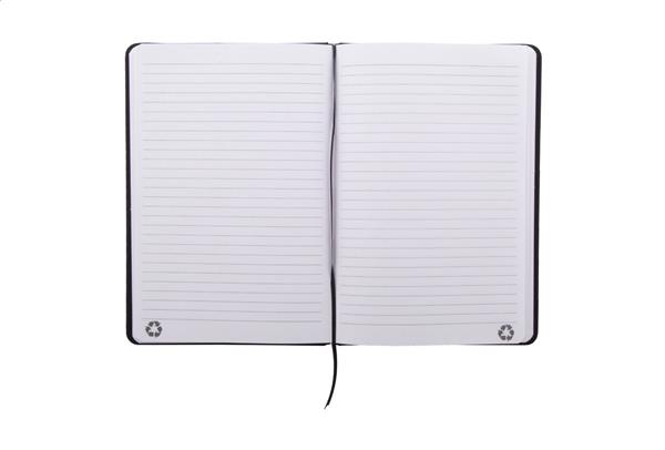 Notes z okładką ze skóry PU z recyklingu ze 100 kartkami w linie z papieru z recyklingu. Z dopasowaną kolorystycznie zakładką i gumką. Rozmiar A5.