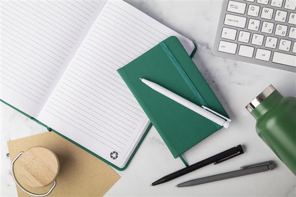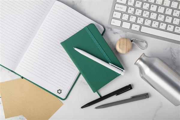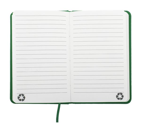 Notes z okładką ze skóry PU z recyklingu ze 100 kartkami w linie z papieru z recyklingu. Z dopasowaną kolorystycznie zakładką i gumką. Rozmiar A6.