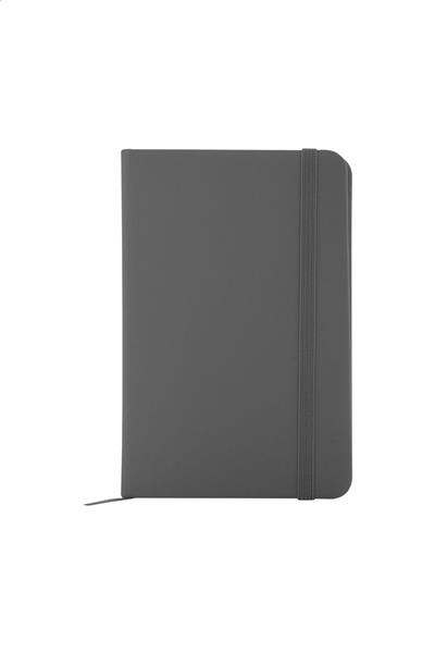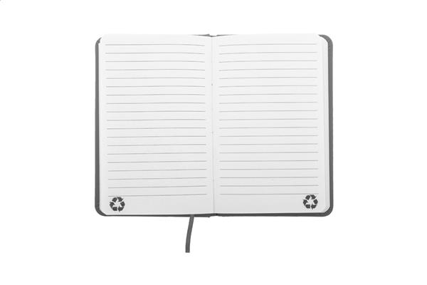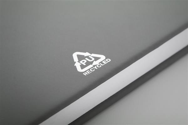 Notes z okładką ze skóry PU z recyklingu ze 100 kartkami w linie z papieru z recyklingu. Z dopasowaną kolorystycznie zakładką i gumką. Rozmiar A6.
