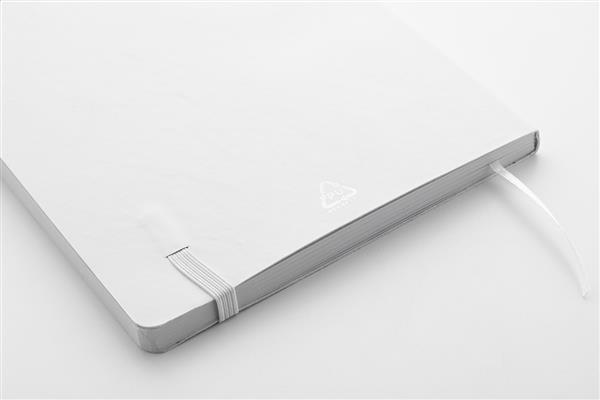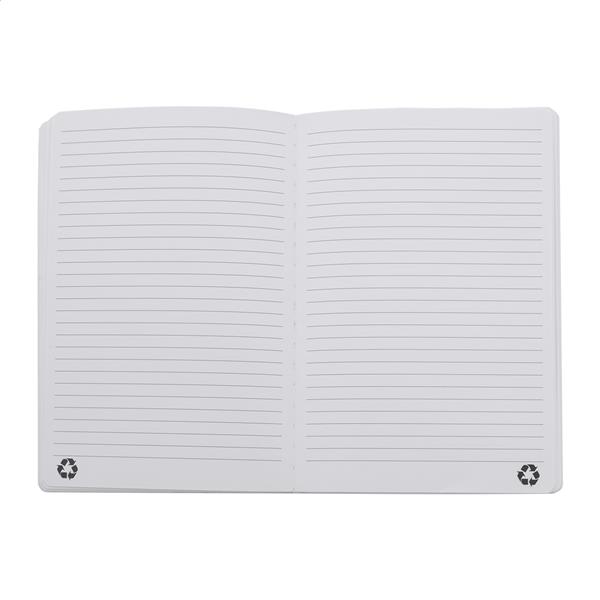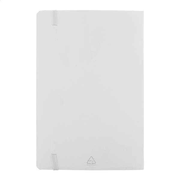 Notes z miękką okładką ze skóry PU z recyklingu, z 80 kartkami w linie z papieru z recyklingu. Z zakładką w pasującym kolorze i gumką. Rozmiar A5.