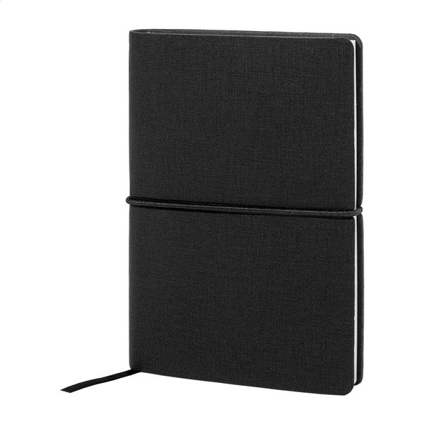 Notes w oprawie z recyklingowanej skóry PU, z 70 kartkami w linie z papieru z recyklingu, 25 karteczkami samoprzylepnymi i 125 zakładkami (w 5 różnych kolorach). Z zakładką i poziomym gumowym paskiem. Format A6.