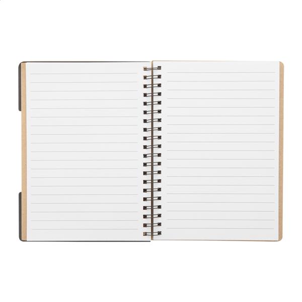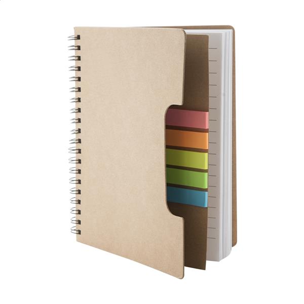 Notes spiralny z papieru z recyklingu z 60 kartkami w linie oraz karteczkami samoprzylepnymi (5×25 szt.).