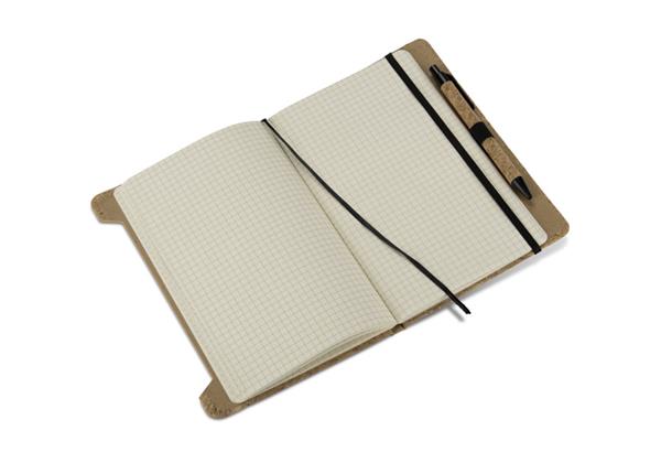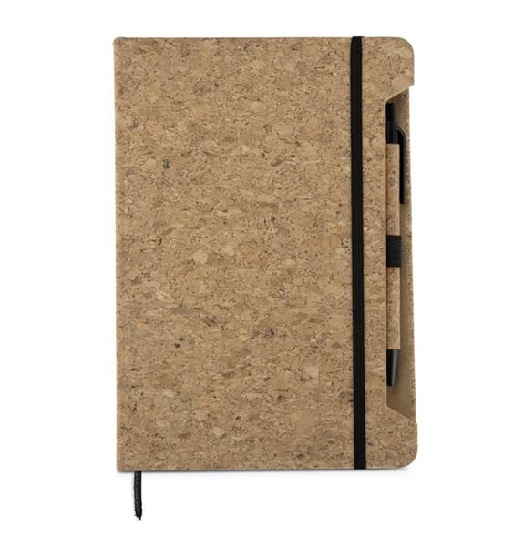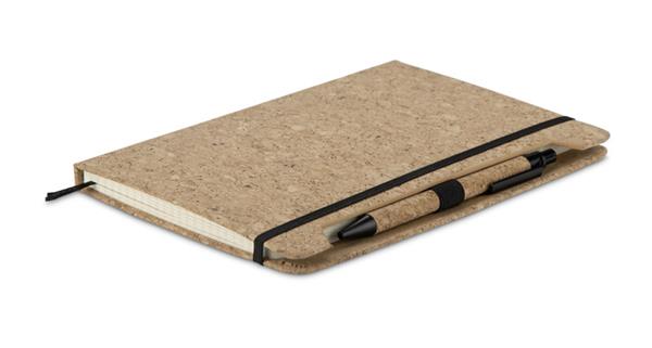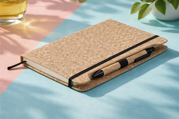 Notes SKRIP A5 przyciąga uwagę okładką z naturalnego korka o wyraźnej, organicznej fakturze. W zestawie znajduje się długopis wykonany częściowo z tego samego materiału, co tworzy spójną i efektowną całość. Wewnątrz znajduje się 80 białych kartek w kratkę (gramatura 70 g/m2), a całość zabezpieczona jest elastyczną gumką. Notes jest szyty, co zapewnia komfort podczas użytkowania i otwierania na płasko. Funkcjonalny i stylowy – doskonały do zestawów promocyjnych lub jako indywidualny upominek reklamowy.