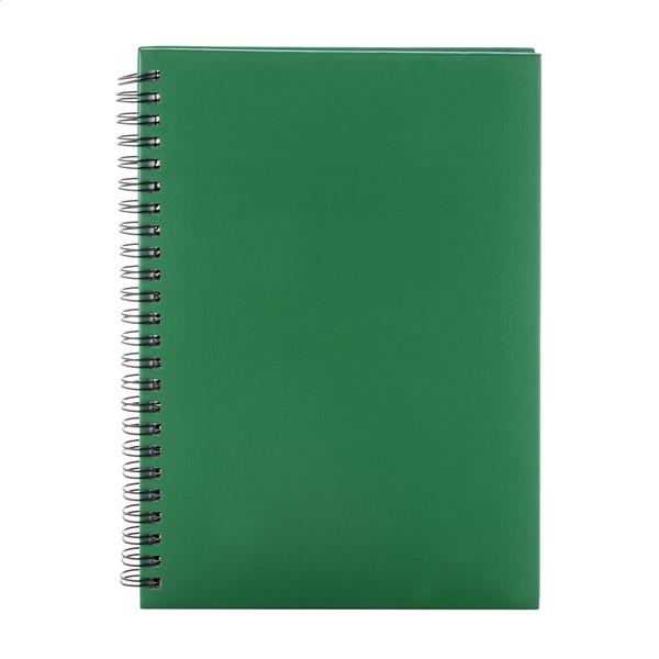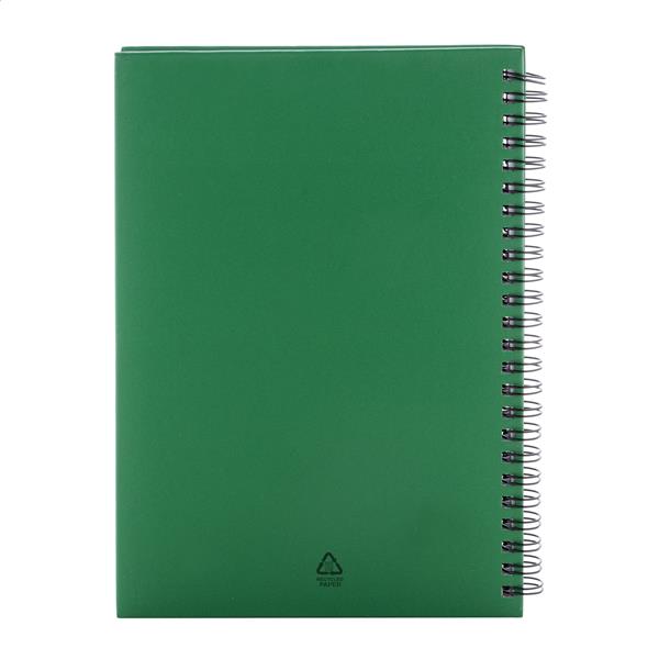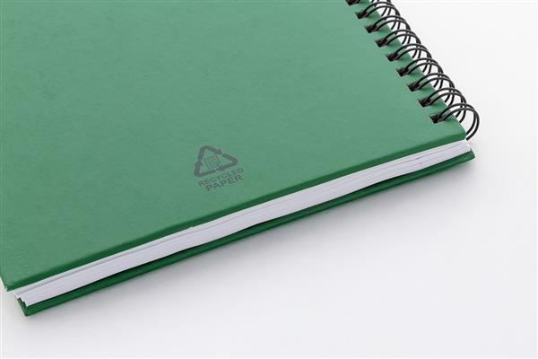 Spiralny notes w oprawie z papieru z recyklingu, zawierający 80 kartek w linie z papieru z recyklingu. Format A5.