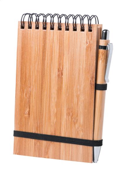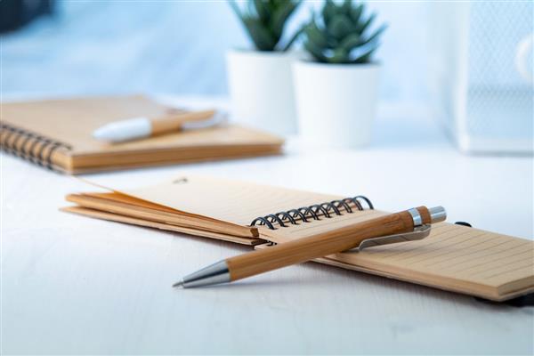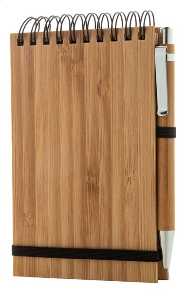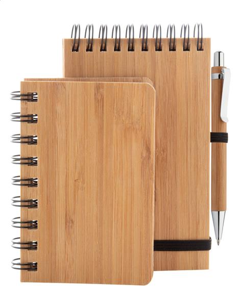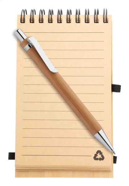 Notes spiralny z okładką bambusową. 70 kartek w linie i bambusowy długopis z niebieskim wkładem.