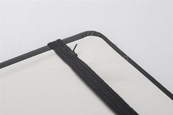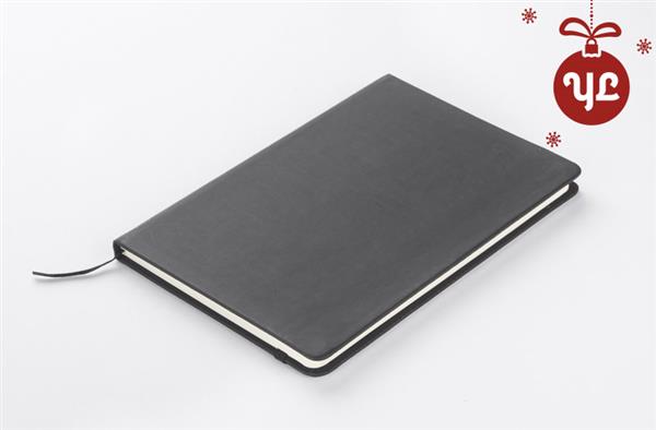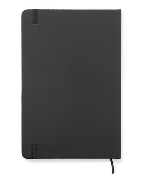 Gustowny notes A5 z kolorową gumką wykonany z materiału skóropodobnego (PU). Notes zawiera 80 kartek ecru w linie koloru pomarańczowego. Logo nadrukujemy na okładce.