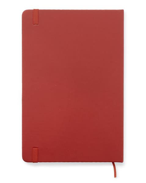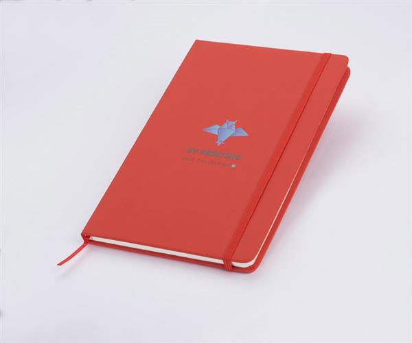 Gustowny notes A5 z kolorową gumką wykonany z materiału skóropodobnego (PU). Notes zawiera 80 kartek ecru w linie koloru pomarańczowego. Logo nadrukujemy na okładce.