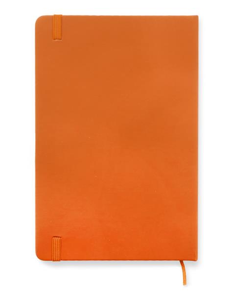 Gustowny notes A5 z kolorową gumką wykonany z materiału skóropodobnego (PU). Notes zawiera 80 kartek ecru w linie koloru pomarańczowego. Logo nadrukujemy na okładce.