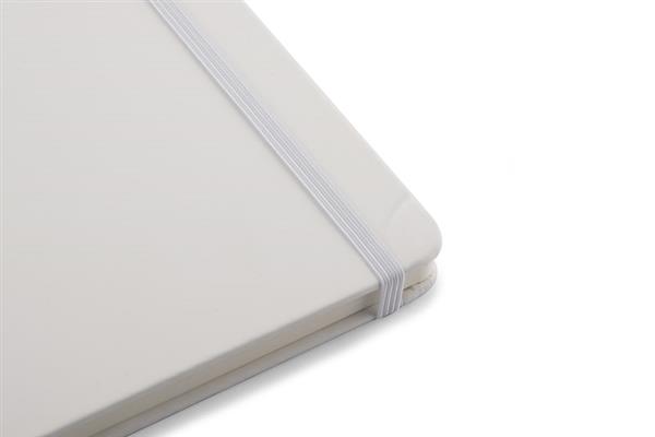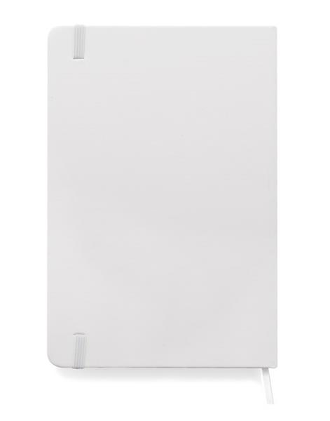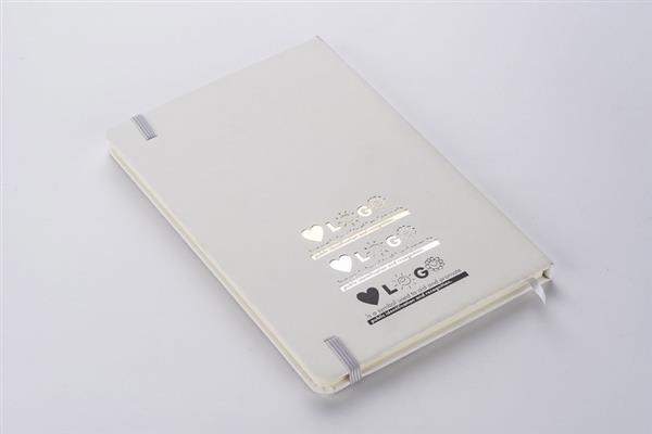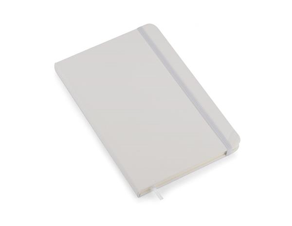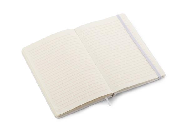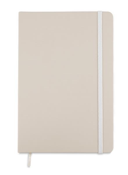 Gustowny notes A5 z kolorową gumką wykonany z materiału skóropodobnego (PU). Notes zawiera 80 kartek ecru w linie koloru pomarańczowego. Logo nadrukujemy na okładce.