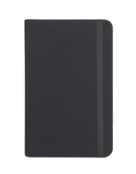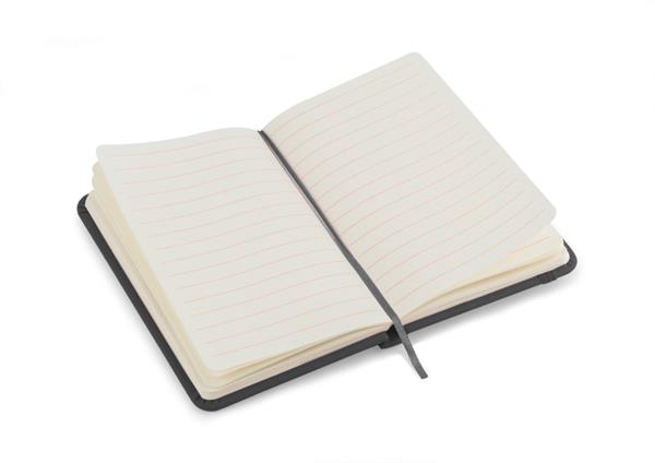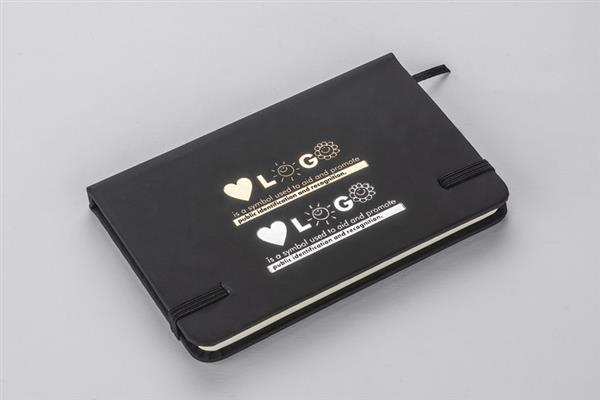 Gustowny notes A6 z kolorową gumką wykonany z materiału skóropodobnego (PU). Notes zawiera 80 kartek ecru w linie koloru pomarańczowego. Logo nadrukujemy na okładce.