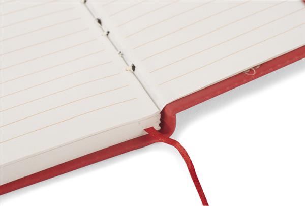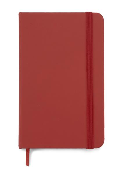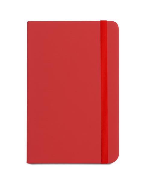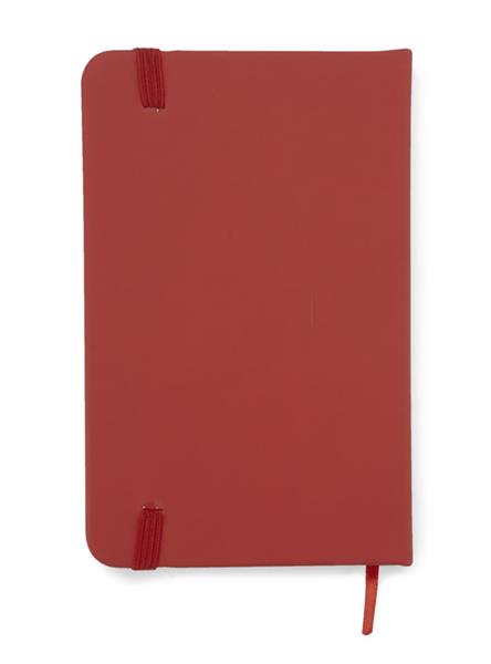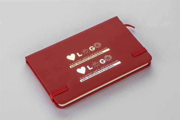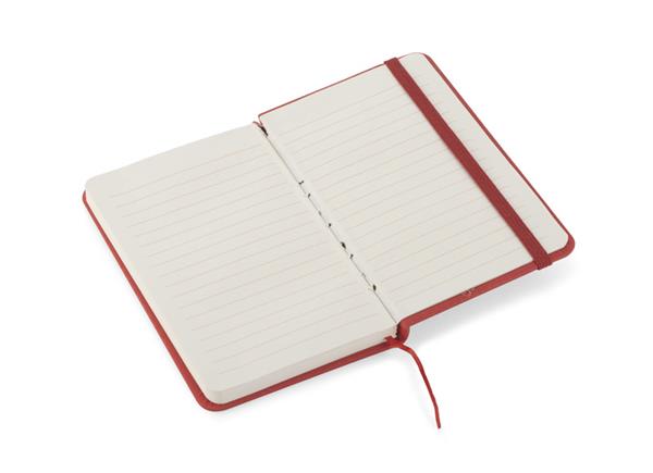 Gustowny notes A6 z kolorową gumką wykonany z materiału skóropodobnego (PU). Notes zawiera 80 kartek ecru w linie koloru pomarańczowego. Logo nadrukujemy na okładce.