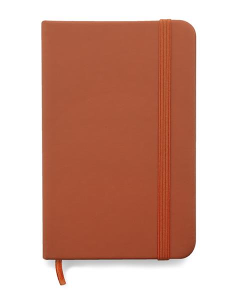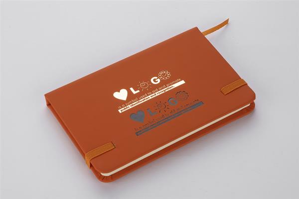 Gustowny notes A6 z kolorową gumką wykonany z materiału skóropodobnego (PU). Notes zawiera 80 kartek ecru w linie koloru pomarańczowego. Logo nadrukujemy na okładce.