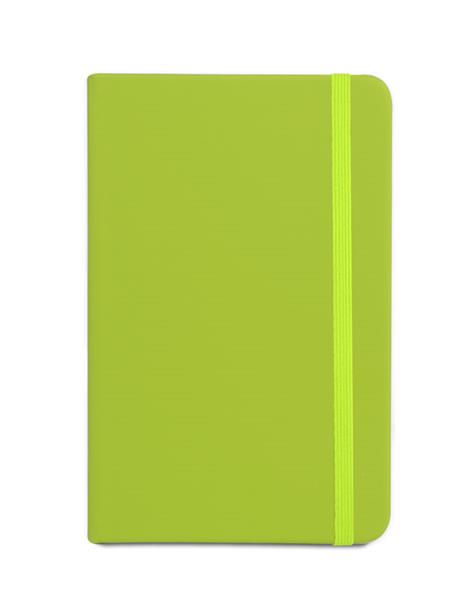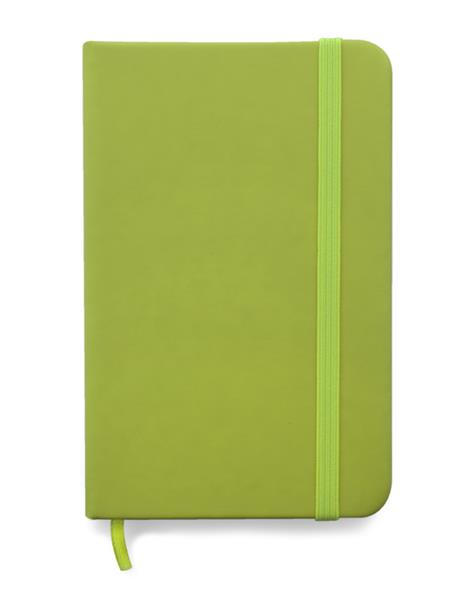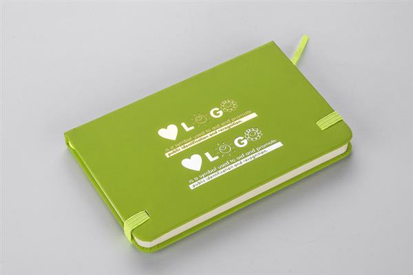 Gustowny notes A6 z kolorową gumką wykonany z materiału skóropodobnego (PU). Notes zawiera 80 kartek ecru w linie koloru pomarańczowego. Logo nadrukujemy na okładce.
