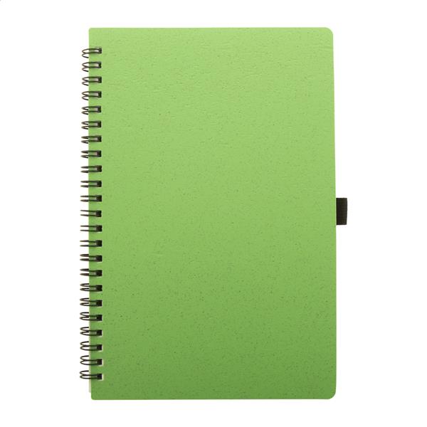 Ekologiczny notatnik spiralny, pokryty plastikiem ze słomy pszenicznej, zawierający 70 kartek w linie, wykonany z papieru pochodzącego z recyklingu, z uchwytem na długopis, format A5.