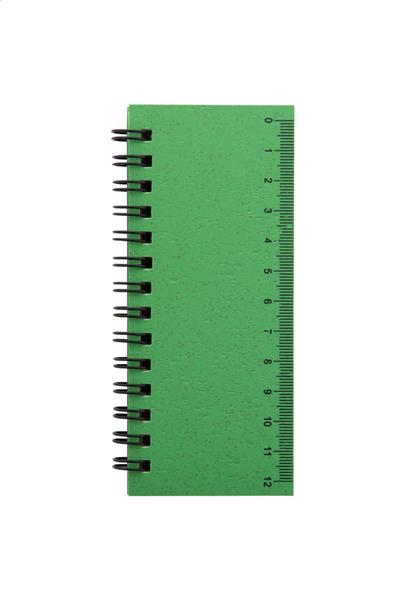Notes spiralny z okładką z ekologicznego plastiku ze słomy pszenicznej, 40 kartek w linie z papieru z recyklingu, 25 karteczek samoprzylepnych i 125 zakładek (w 5 różnych kolorach). Z linijką 12 cm na okładce.