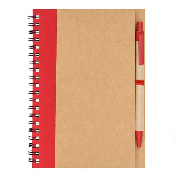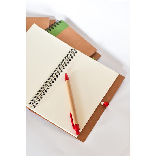 Notes formatu B6 z 70 gładkimi kartkami (70 g/m2) i podwójną spiralą. Dopasowany długopis z kartonu z recyklingu. Wkład w kolorze niebieskim. Dopasowany elastyczny uchwyt na długopis.