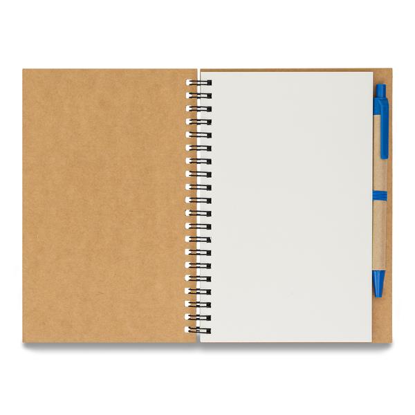 Notes formatu B6 z 70 gładkimi kartkami (70 g/m2) i podwójną spiralą. Dopasowany długopis z kartonu z recyklingu. Wkład w kolorze niebieskim. Dopasowany elastyczny uchwyt na długopis.