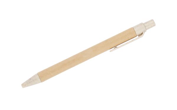 Notes REMATT w ekologicznej okładce wykonanej z recyklingowanego papieru w klasycznym brązowym kolorze. Do notesu dołączony jest długopis z niebieskim wkładem, którego korpus wykonany jest z recyklingowanego papieru, z wykończeniami z tworzywa ze słomy pszennej. Notes zamykany za pomocą gumki. Format A5.