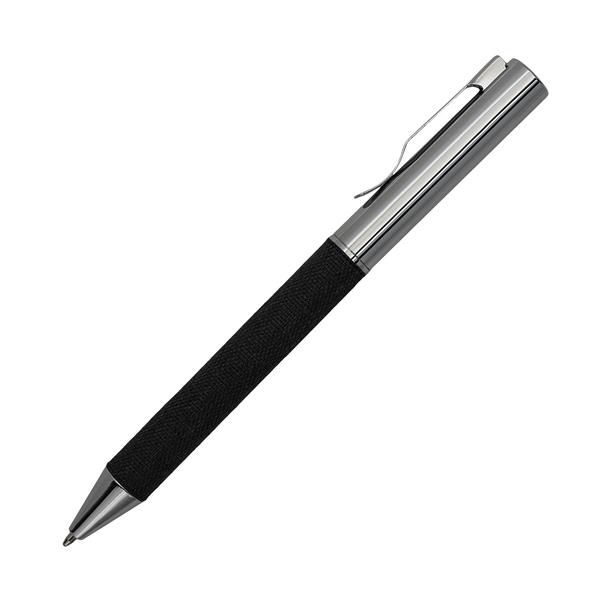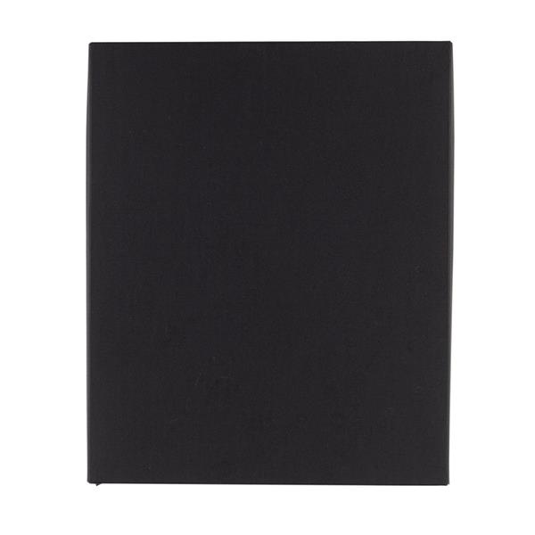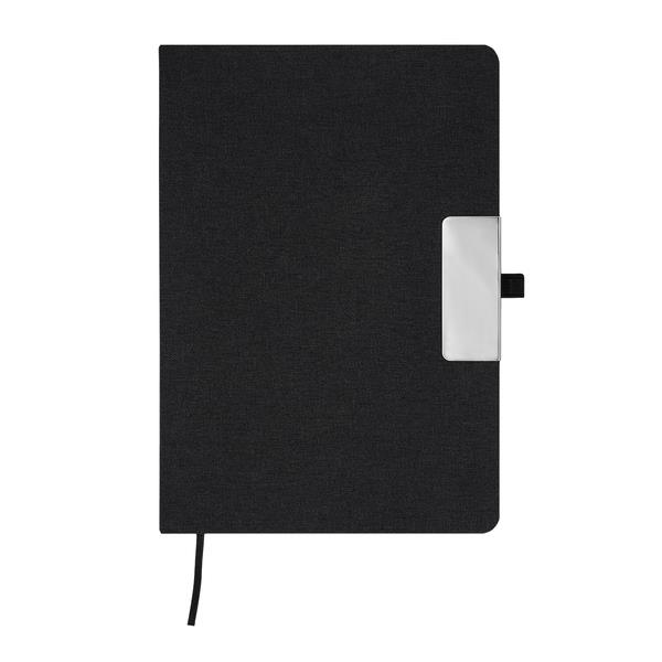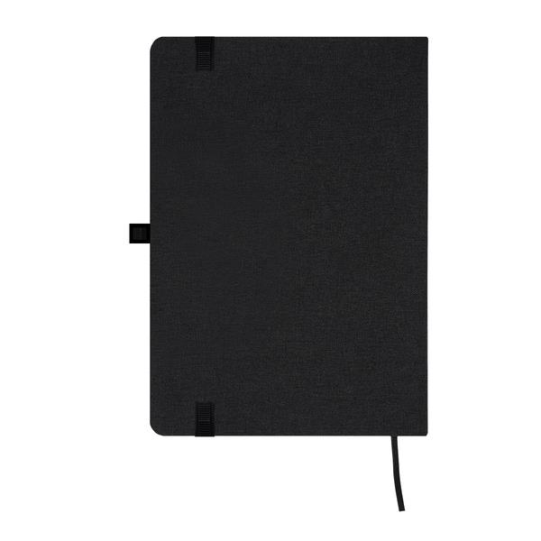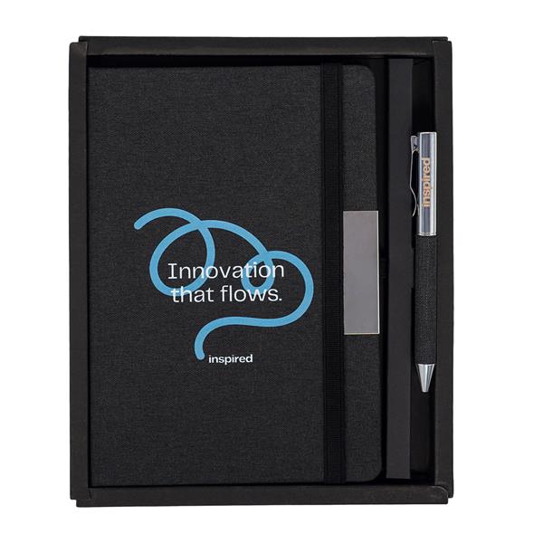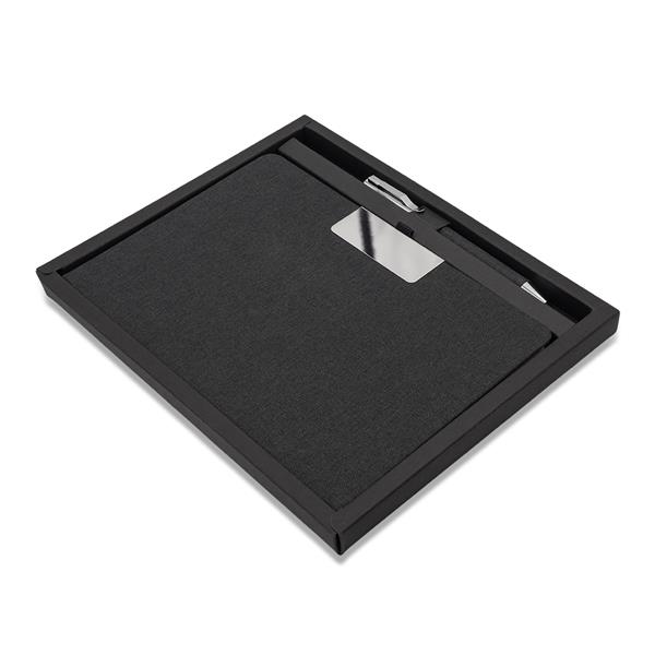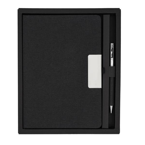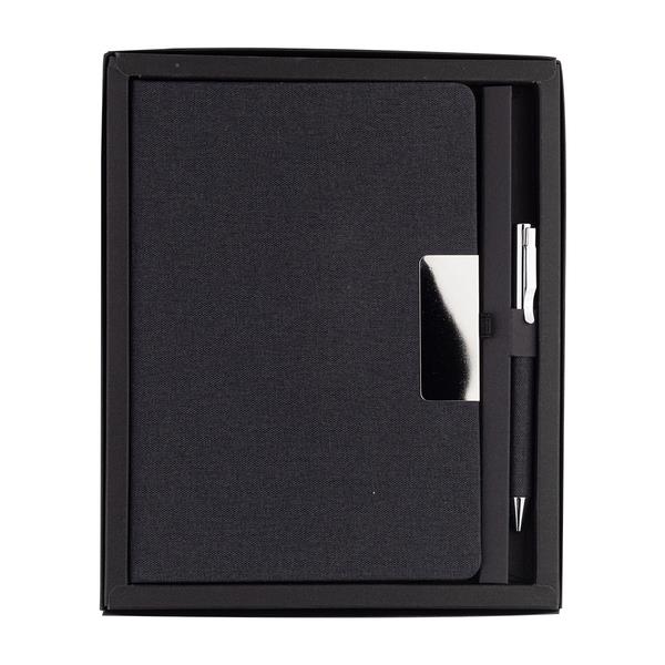 Zestaw upominkowy w pudełku. Notatnik A5 w twardej okładce RPET, z metalowym elementem; 80 kartek w kratkę, o gramaturze 70 g/m2. Metalowy długopis w tkaninie RPET i srebrnymi detalami. Niebieski wkład 1,0 mm.