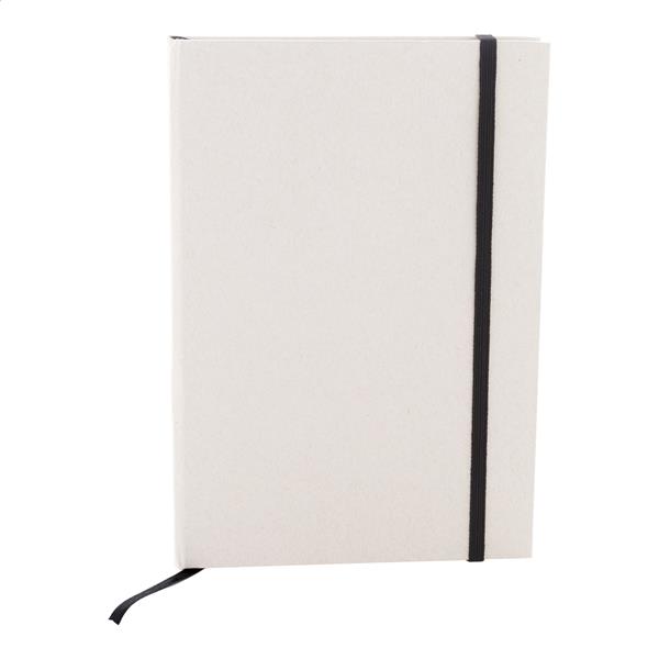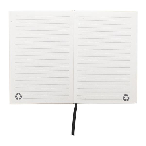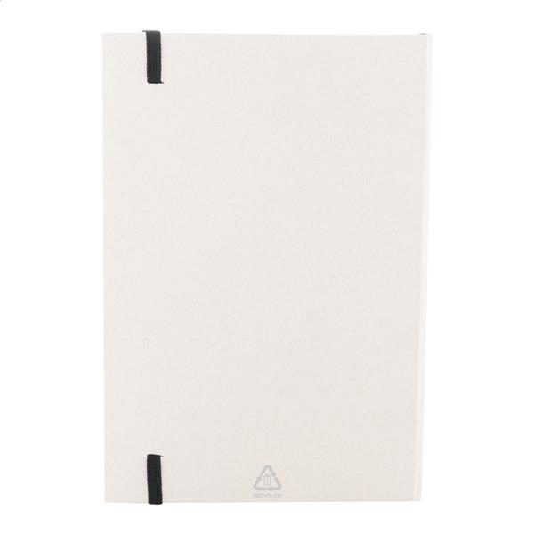 Notes z papieru z recyklingowanego kartonu po mleku, z twardą okładką, 80 kartkami w linie i dopasowaną kolorystycznie gumką. Rozmiar A5.