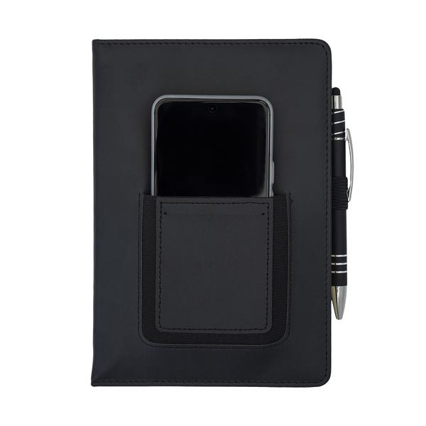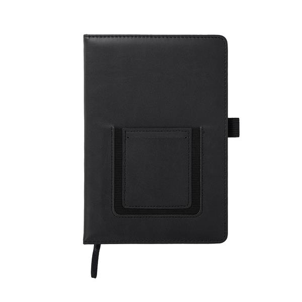 Notes A5 wyposażony w elastyczną kieszeń, która dopasowuje się do wielkości telefonu. Mniejsza kieszonka przeznaczona jest na wizytówki. Twarda oprawa z ekoskóry. 100 kartek w linię, gramatura 80 g/m2. Elastyczny uchwyt na długopis.