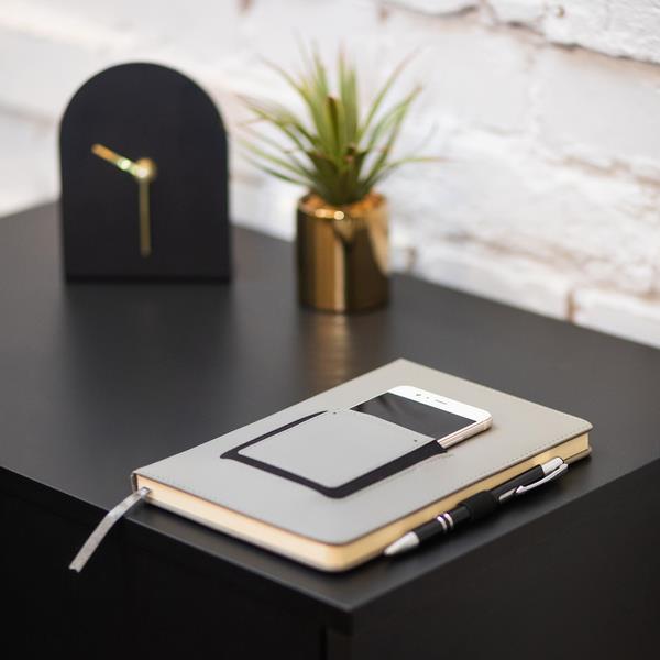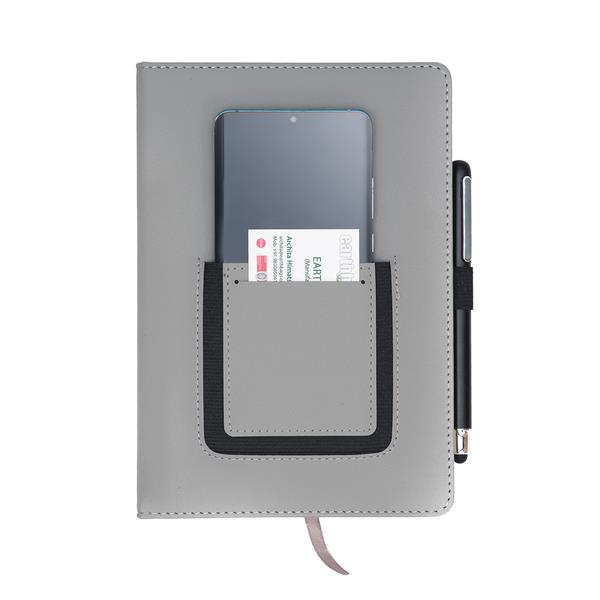 Notes A5 wyposażony w elastyczną kieszeń, która dopasowuje się do wielkości telefonu. Mniejsza kieszonka przeznaczona jest na wizytówki. Twarda oprawa z ekoskóry. 100 kartek w linię, gramatura 80 g/m2. Elastyczny uchwyt na długopis.