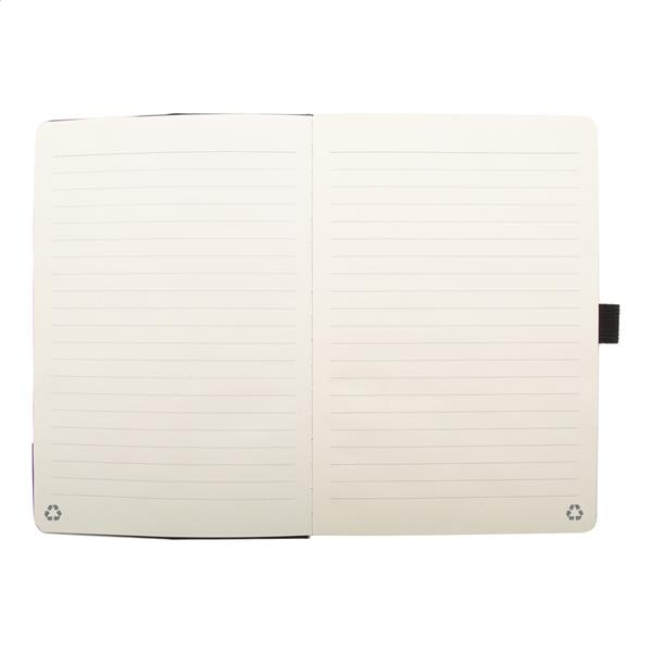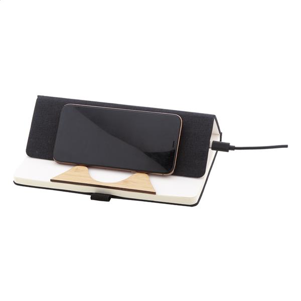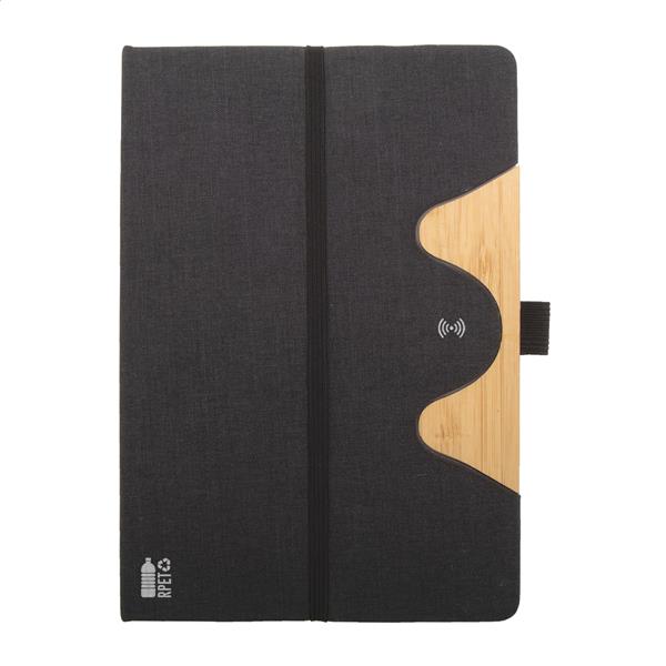 Notes z okładką z poliestru RPET, z wkładką bambusową, funkcją uchwytu na telefon i wbudowaną szybką ładowarką indukcyjną (15W). Zawiera 80 kartek w linie z papieru makulaturowego. Rozmiar A5. W zestawie kabel do ładowarki USB.