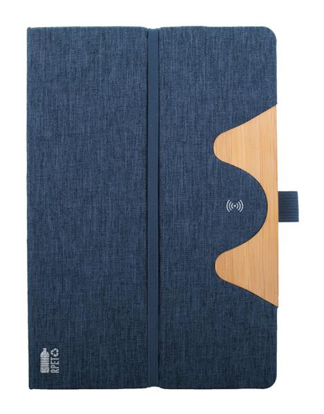 Notes z okładką z poliestru RPET, z wkładką bambusową, funkcją uchwytu na telefon i wbudowaną szybką ładowarką indukcyjną (15W). Zawiera 80 kartek w linie z papieru makulaturowego. Rozmiar A5. W zestawie kabel do ładowarki USB.