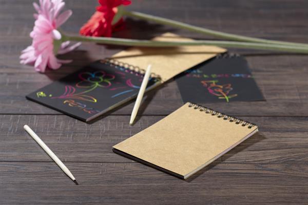 Nietypowy notesik z czarnymi kartkami do zdrapywania. Za pomocą bambusowego patyczka można wykonać kolorowy, tęczowy obrazek. Pozwala to na rozwijanie wyobraźni poprzez możliwość tworzenia własnych kompozycji zdrapywanek.