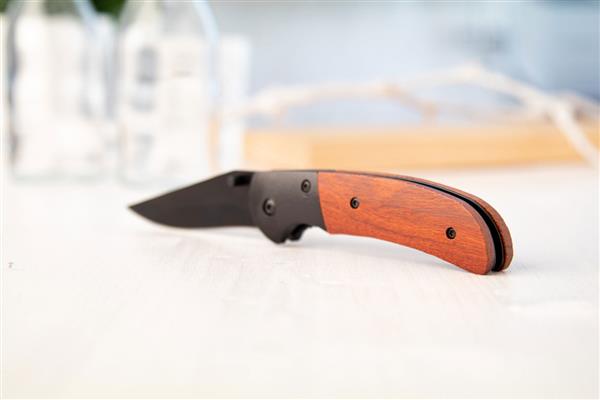Nóż składany ze stali nierdzewnej z drewnianą rączką i zamkiem bezpieczeństwa.