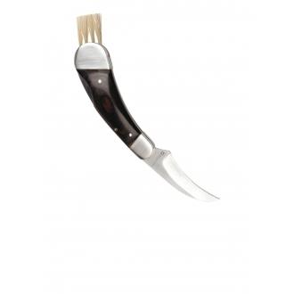 Nóż do zbierania grzybów, wykonany ze stali nierdzewnej i drewna, wyposażony w pędzelek do czyszczenia grzybów.