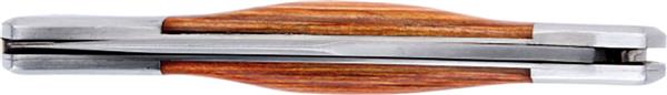 Składany nóż wykonany ze stali nierdzewnej, z drewnianą rękojeścią i blokadą bezpieczeństwa.