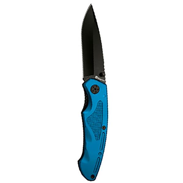 Nóż kieszonkowy wykonany ze stali nierdzewnej z aluminiową rękojeścią i klipsem do mocowania na pasku.