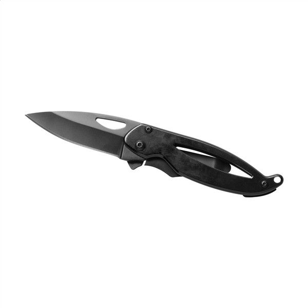 Metalowy nóż kieszonkowy z zabezpieczeniem.